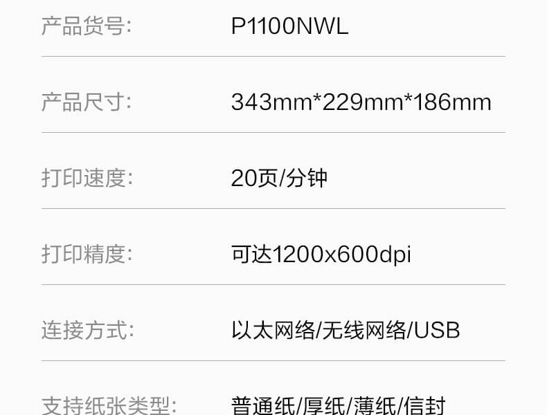 物料描述:P1100NWL纽诗黑白激光打印机(白色)(台)